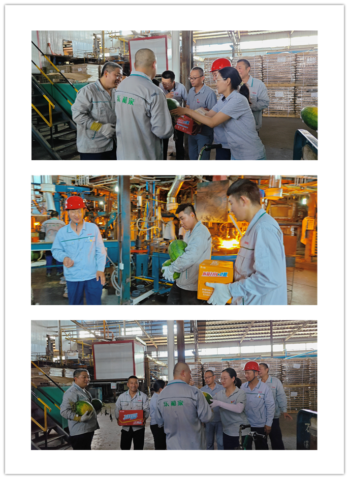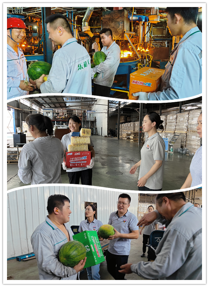 由于曜暉所處行業(yè)比較特殊,從原料粉末、熔化、玻璃液到成品,整個生產(chǎn)流程都需在高溫環(huán)境下實現(xiàn)。合影結(jié)束后,黨員代表深入車間現(xiàn)場開展迎“七一”送清涼活動,將濃濃關懷送到職工心坎上,代表們來到車間,把清涼的大西瓜、飲料、菊花茶等防暑降溫物品送到員工手中,為他們帶去絲絲涼意。雖然工作環(huán)境高溫悶熱,但工人們認真積極工作的態(tài)度始終如一,令人敬佩。